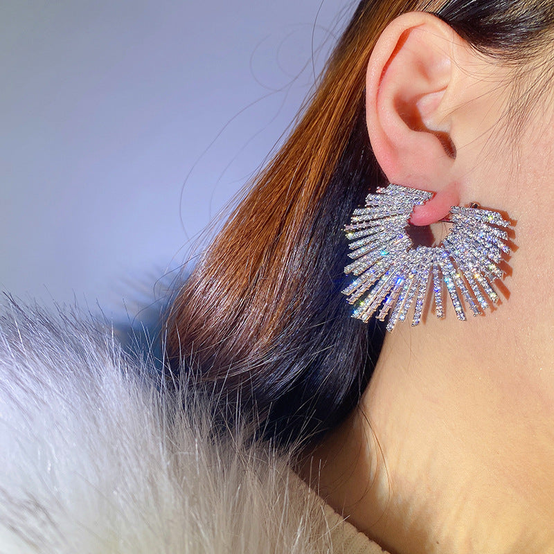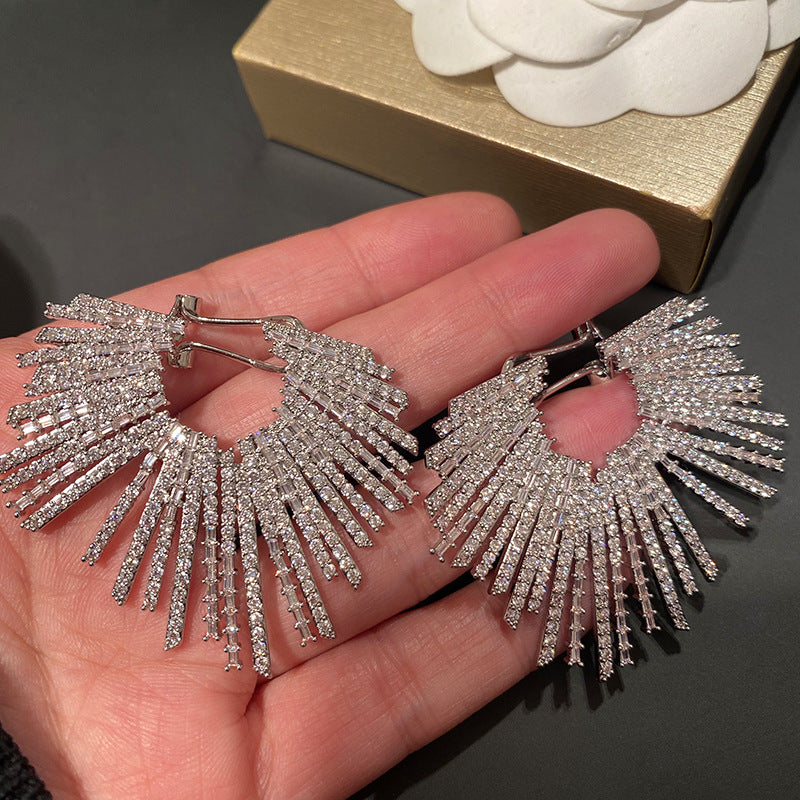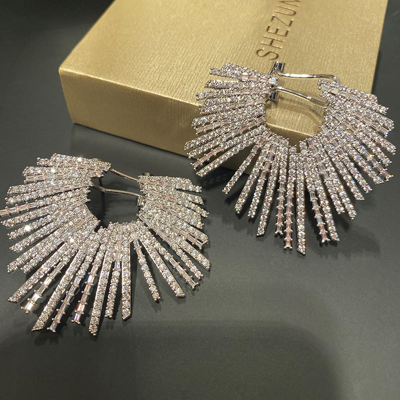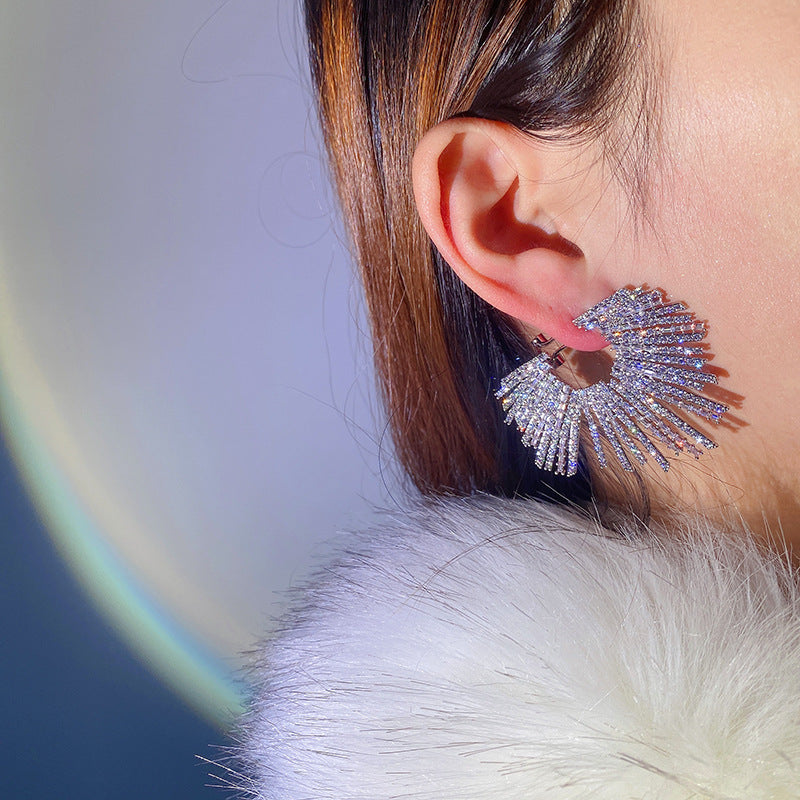 أقراط مرصعة بالألماس والزركون بالكامل على شكل مروحة ألعاب نارية - أقراط أنيقة وعصرية تناسب الطبقة الراقية